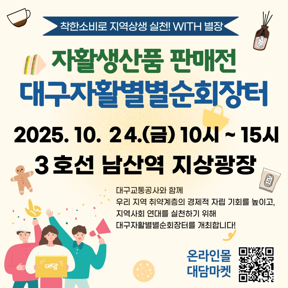 2025년 10월 24일(목) 10시 ~ 15시 3호선 남산역 지상광장에서 대구자활별별장터가 진행됩니다! |