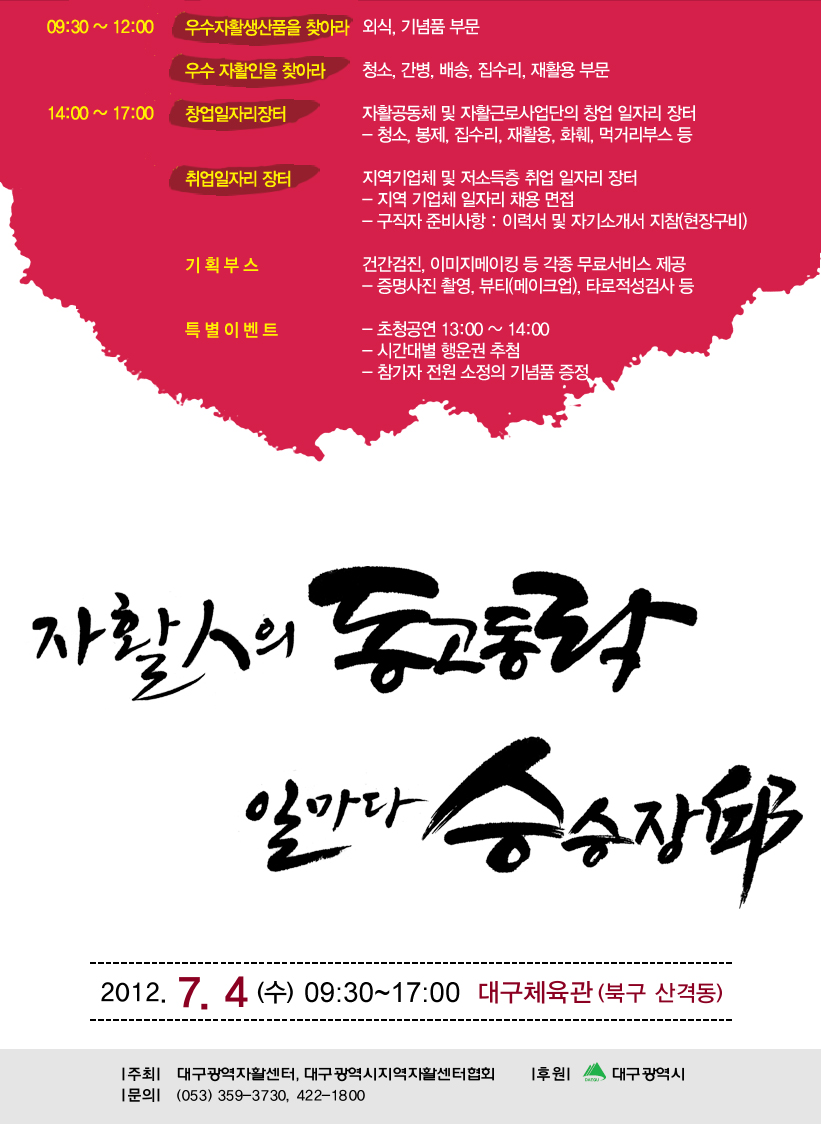 창출 기회를 제공하는 "자활 취·창업 일자리장터"와 우수 자활생산품 및 자활인 발굴로 지역자활사업 활성화와 품질 향상의 계기를 마련하고자 하는 "우수 자활생산품·자활인을 찾아라" 행사를 다음과 같이 개최하고자 합니다. 1) 행사명 : 「자활人의 동고동락, 일마다 승승장邱」 2) 일 시 : 2012. 07. 04(수) 09:30~17:00 3) 장 소 : 대구실내체육관(북구 산격동) 4) 대 상 : 대구지역 저소득층 및 시민 2,000여명 5) 내 용 - 1부 : "일마다 승승장邱" 우수 자활생산품·자활인을 찾아라 - 2부 : 기념식 - 3부 : 자활 취·창업 일자리 장터 5) 주최 : 대구광역자활센터, 대구광역시지역자활센터협회 6) 후원 : 대구광역시 |