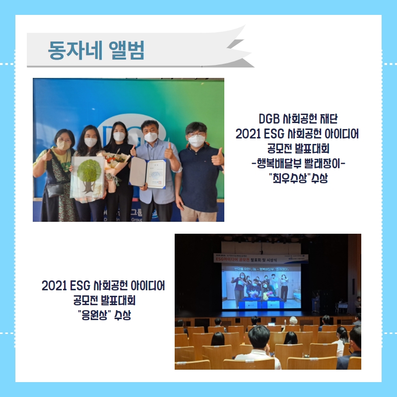 | 이전글 | DGB "2021 ESG 사회공헌 아이디어 공모전 발표대회" 최우수상 / 응원상 수상 |
